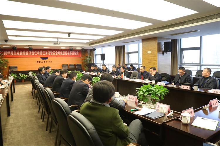 2018年1月3日上午,2018年度職業經理經濟責任考核任務書暨安全環保責任書簽訂儀式在閏土大廈舉行。阮靜波董事長、徐萬福總經理等高層領導與各職業經理齊聚一堂,為做好公司新一年度的安全環保工作謀篇布局。