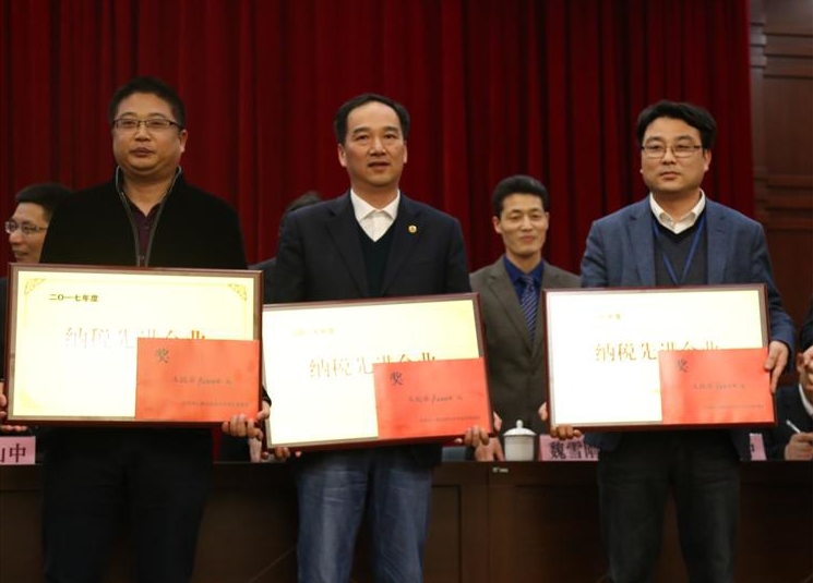 閏土新材料公司董事長周杰文、迪邦公司總經(jīng)理陳曉棟分別領(lǐng)取“納稅先進(jìn)企業(yè)”獎(jiǎng)項(xiàng)
