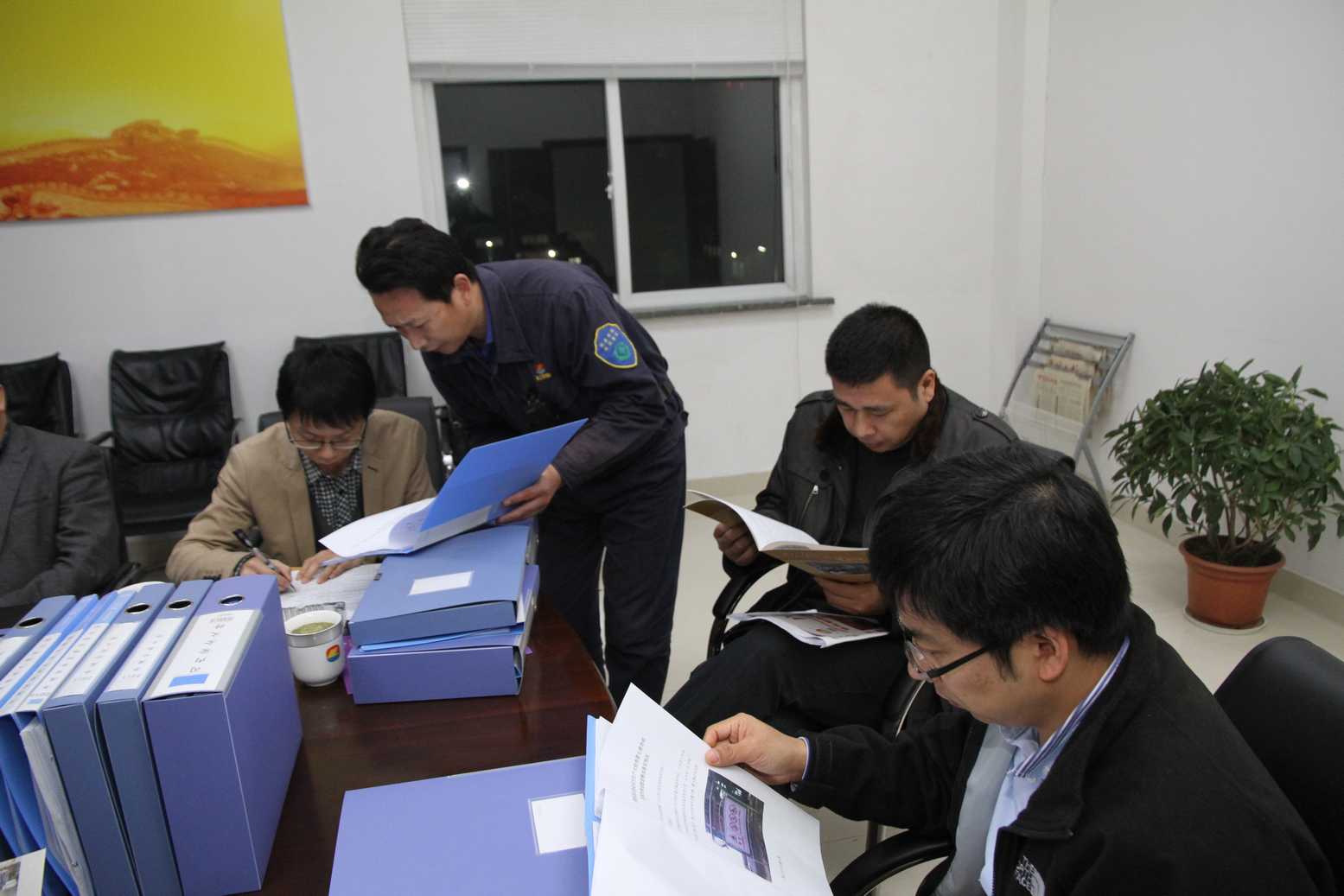 檢查組領導在認真聽取企業關于安全生產工作的匯報。圖中,中間為國家安監總局職業健康司副司長王建冬、左一為省安監局總工程師李公杭、右一為紹興市政府副秘書長章國金。